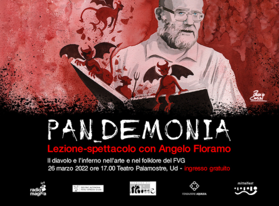 La seconda data da segnare per tutti, comprese scuole e famiglie, è sabato 26 marzo alle ore 17.00 al Teatro Palamostre di Udine con la lezione-spettacolo gratuito Pan_Demonia condotto dallo storico ed esperto medievalista Angelo Floramo che, come una specie di Virgilio, ci guiderà in un vero e proprio viaggio in Friuli Venezia Giulia, alla scoperta di alcune rappresentazioni del diavolo e dell’inferno nell’arte e nel folklore regionale. Durante lo spettacolo, attraverso la lettura di storie, scritte anche da Roberto Piumini, scopriremo come la figura del diavolo abbia sempre suscitato nell’animo umano molta paura, ma allo stesso tempo anche una grande fascinazione. Le voci narranti saranno quelle degli attori Daniela Gattorno e Francesco Godina, che in questo magico viaggio sarà accompagnata dalle illustrazioni dal vivo di Paolo Cossi e dalla musica dell’arpista Luigina Feruglio. Presenterà lo spettacolo Martina Delpiccolo.